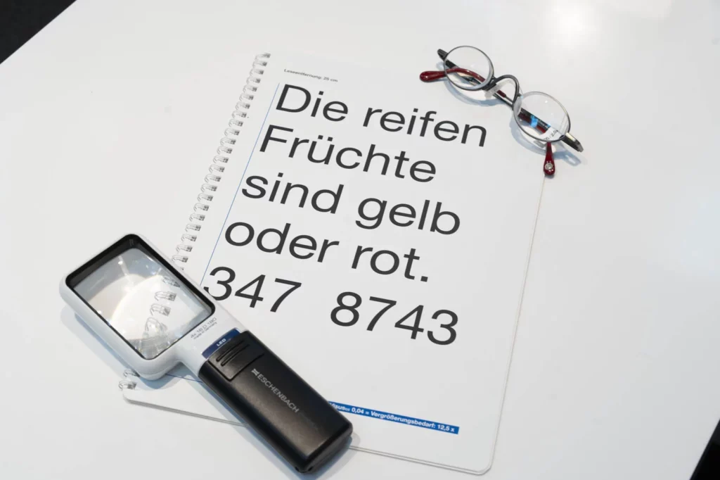 Für Menschen mit starker Sehschwäche bieten wir eine eigene Abteilung für vergrößernde Sehhilfen. In enger Zusammenarbeit mit dem Schweizerischen Blinden- und Sehbehindertenverband sowie Augenärzt:innen passen wir individuelle Hilfsmittel gezielt an. Ob Lupenbrille mit mehrfacher Vergrößerung, Spezialbrille oder elektronische Sehhilfe – Ziel ist es, die bestmögliche visuelle Rehabilitation zu erreichen, um den Alltag wieder zu erleichtern. Diese Hilfsmittel kommen besonders bei Erkrankungen wie Makuladegeneration, Glaukom oder nach Operationen zum Einsatz, wenn das normale Sehen dauerhaft eingeschränkt ist.